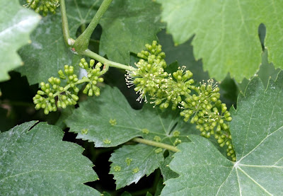 Vitis vinifera «videira-europeia» . N.b. pétalas caducas na floração tombando em conjunto (vd. caliptras dispersa na folha situada imediatamente abaixo do cacho)