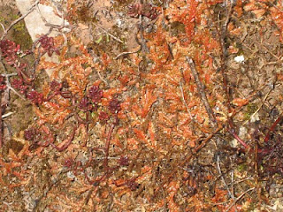Na foto de baixo, a selaginela aparece na companhia de um belo líquen (ou fungo?) de botões vermelhos, num local arenítico; na segunda e na primeira fotos, provenientes de calcários do CW. calc., a selaginela aparece na simpática companhia de Sedum album L. (Crassulaceae) e de Narcissus calcicola Mendonça (Amaryllidaceae), já na fase de frutificação.